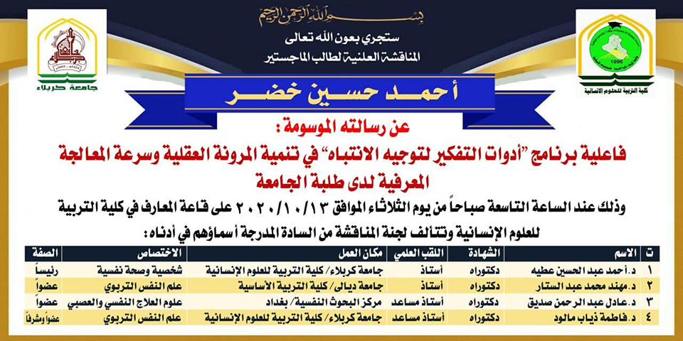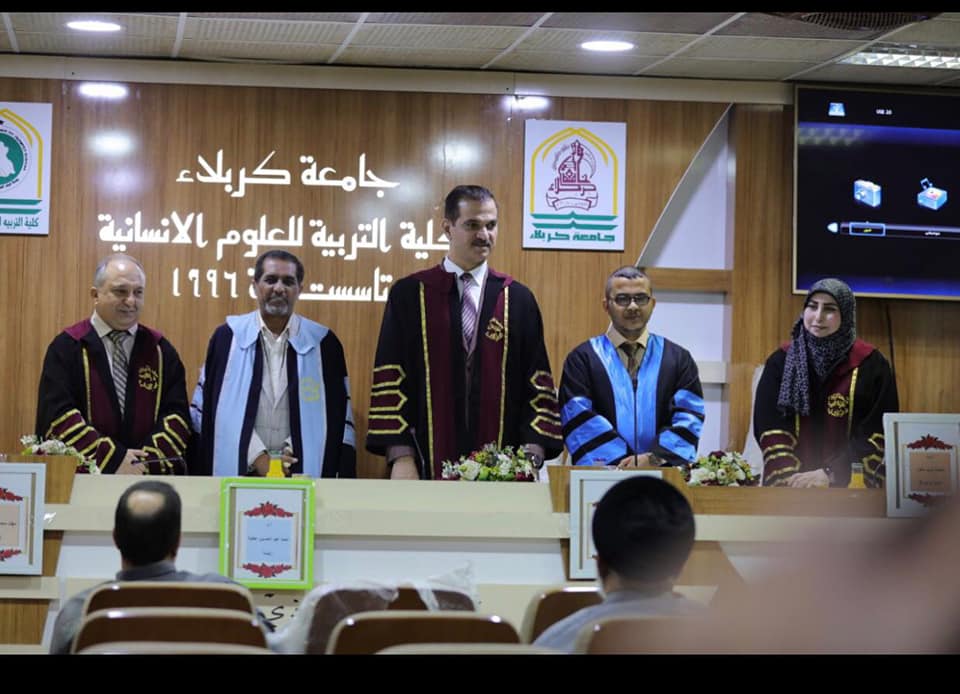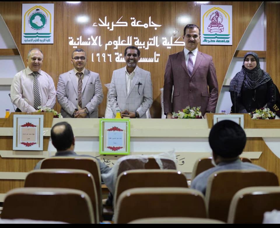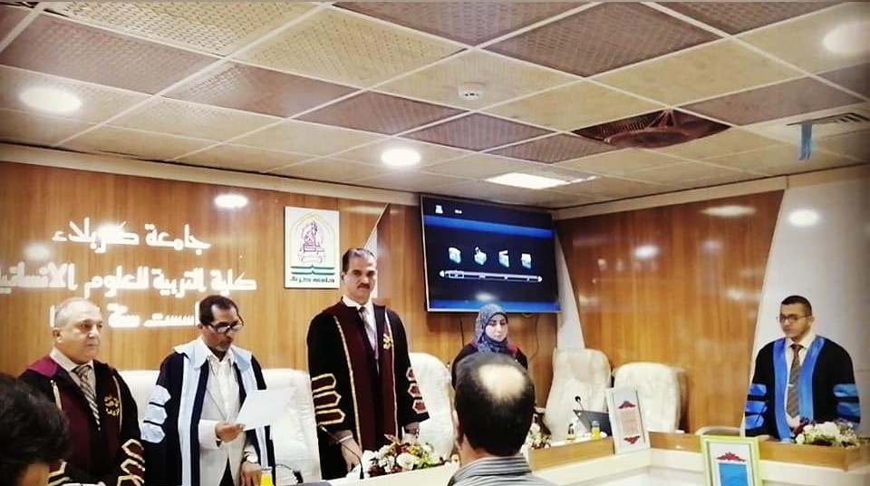 وذلك في تمام الساعة التاسعة صباحاً من يوم الثلاثاء الموافق 13-10-2020م من على قاعة المعارف في كلية التربية للعلوم الإنسانية في جامعة كربلاء… وتألفت لجنة المناقشة من السادة المدرجة أسماؤهم في ادناه: