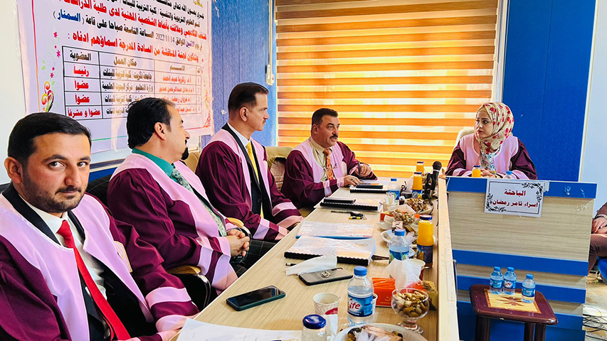 وذلك في تمام الساعة التاسعة صباحاً من يوم الأثنين الموافق 14-11-2022م من على قاعة السمنار في كلية التربية للبنات/ قسم العلوم التربوية والنفسية في جامعة تكريت… وتألفت لجنة المناقشة من السادة المدرجة أسماؤهم في ادناه: