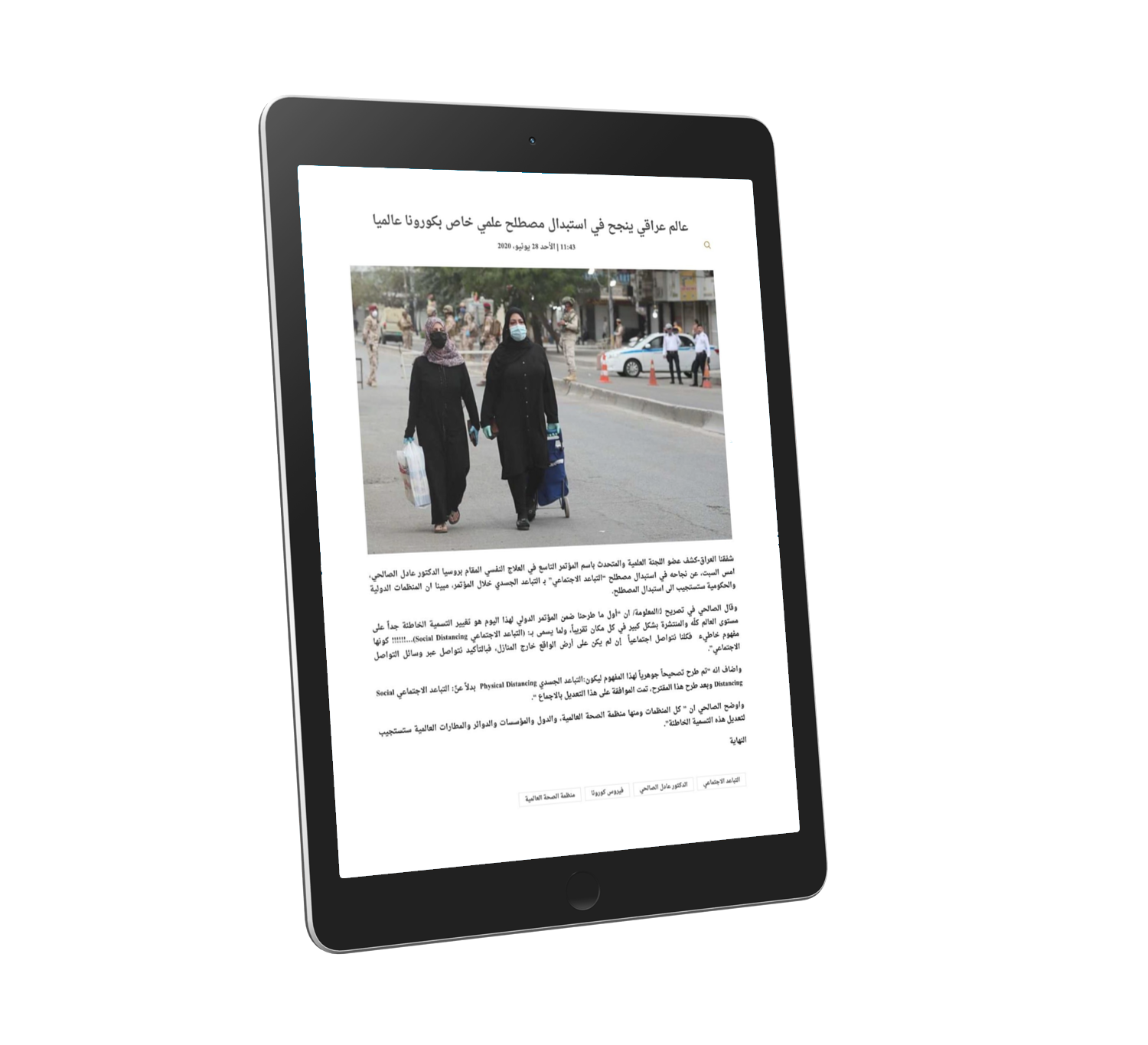ضمن أعمال المؤتمر الدولي التاسع للعلاج النفسي المقام في روسيا للفترة ٢٦ الى ٢٩ حزيران ٢٠٢٠م… تبنت المنظمات الدولية مقترح عضو اللجنة العلمية للمؤتمر الأستاذ المساعد الدكتور عادل عبد الرحمن الصالحي، التدريسي في مركز البحوث النفسية، بأستبدال مصطلح التباعد الاجتماعي Social distancing في ظل جائحة كورونا ليكون التباعد الجسدي Physical distancing وتمت الموافقة على المقترح بأجماع حضور المشاركين من ١١٠ دولة من دول العالم.
