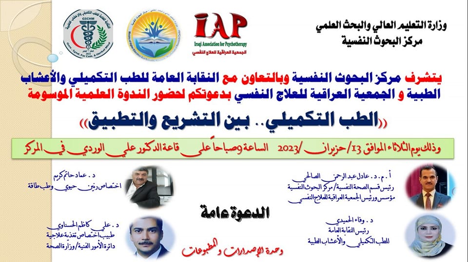 أقام (مركز البحوث النفسية) بالتعاون مع (النقابة العامة للطب التكميلي والاعشاب الطبية) و(الجمعية العراقية للعلاح النفسي) الندوة العلمية الموسومة: (الطب التكميلي… بين التشريع والتطبيق) وذلك في يوم الثلاثاء الموافق ١٣ حزيران ٢٠٢٣م