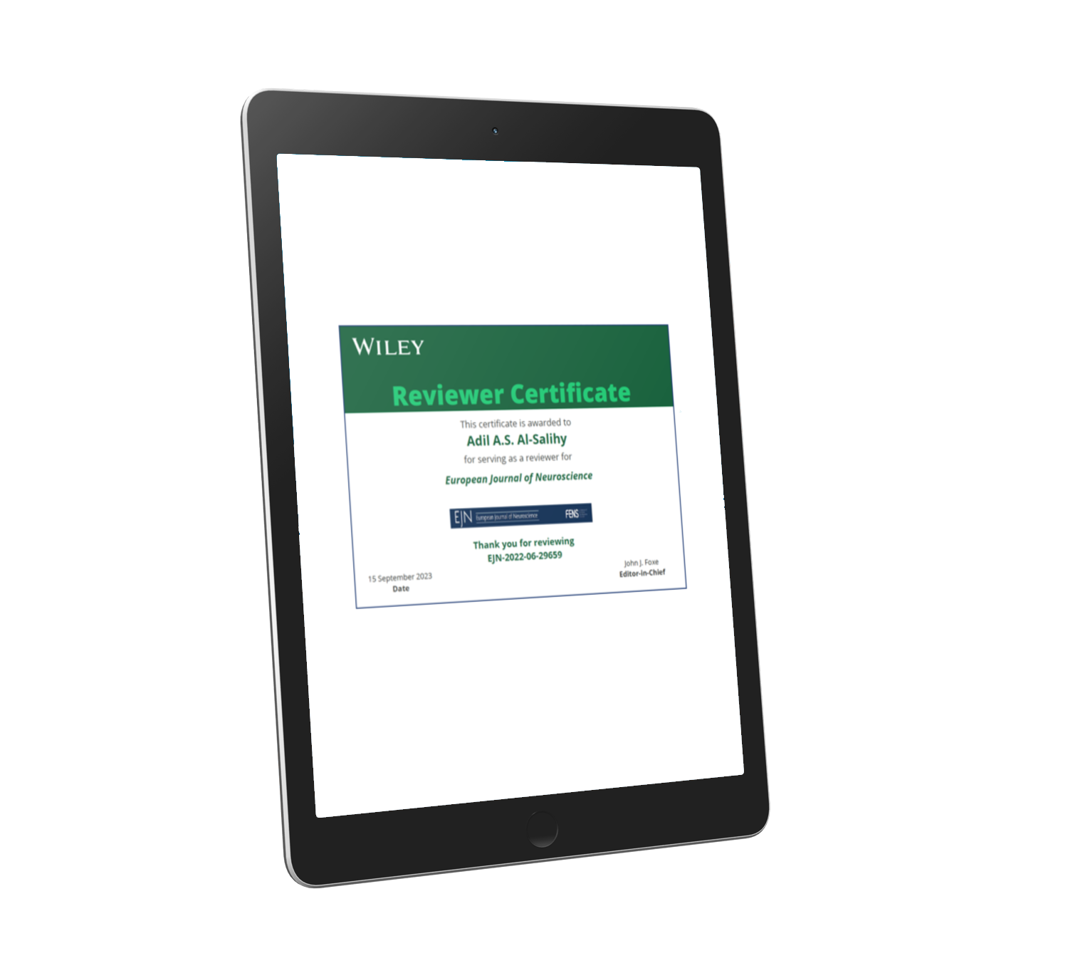 حصل الأستاذ المساعد الدكتور عادل الصالحي/ رئيس قسم الصحة النفسية والتدريسي في مركز البحوث النفسية، ورئيس الجمعية العراقية للعلاج النفسي على شهادة دولية معتمدة بعدّه مقيـّـماً ومراجعاً علمياً Reviewer دولياً للمجلة الأوروبية للعلوم العصبية European Journal of Neuroscience (EJN) العائدة لمؤسسة وايلي Wiley الدولية للنشر.. وهي من المجلات العالمية ذات معامل التأثير العالي في مجال العلوم العصبية والدماغ…