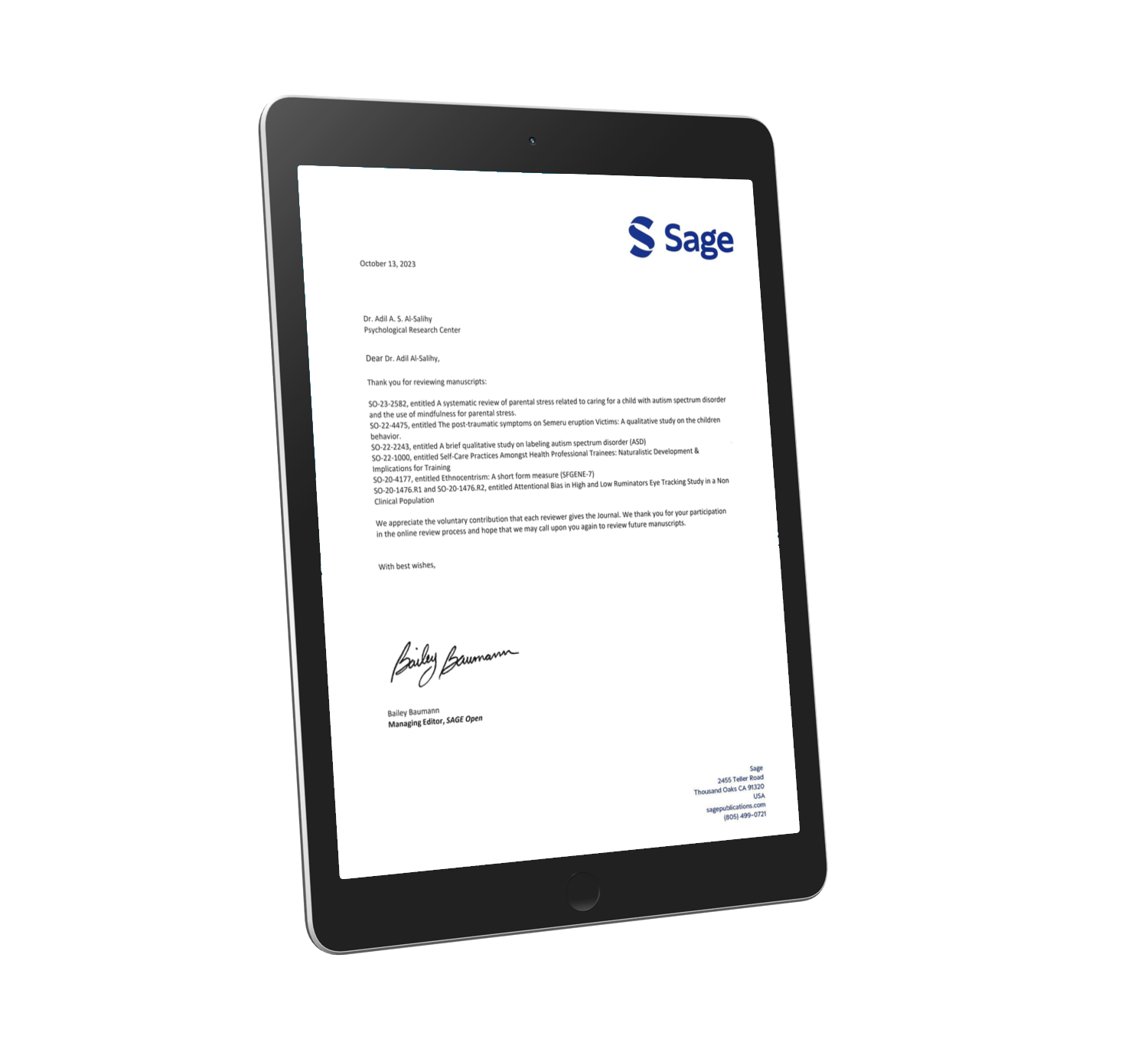 مقيـّـماً ومراجعاً علمياً ومحرراً دولياً للمجلات العلمية التابعة لمؤسسة SAGE الدولية للنشر
