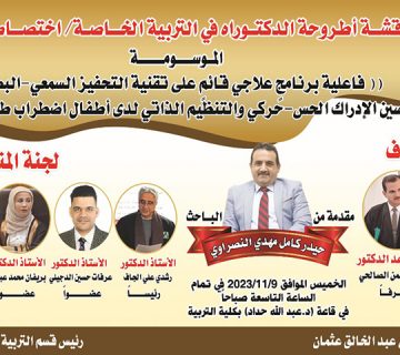 وذلك في تمام الساعة التاسعة من صباح يوم الأحد الموافق 28-1-2024م من على (قاعة الدكتور عبدالله حداد) في قسم التربية الخاصة في كلية التربية/ جامعة صلاح الدين في اربيل، تخصّص (اضطراب طيف التوحد)…
