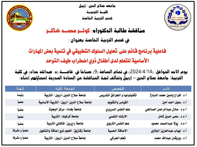 وذلك في تمام الساعة التاسعة من صباح يوم الأحد الموافق 14-4-2024م من على (قاعة الدكتور عبدالله حداد) في قسم التربية الخاصة في كلية التربية/ جامعة صلاح الدين في اربيل، تخصّص (اضطراب طيف التوحد)…