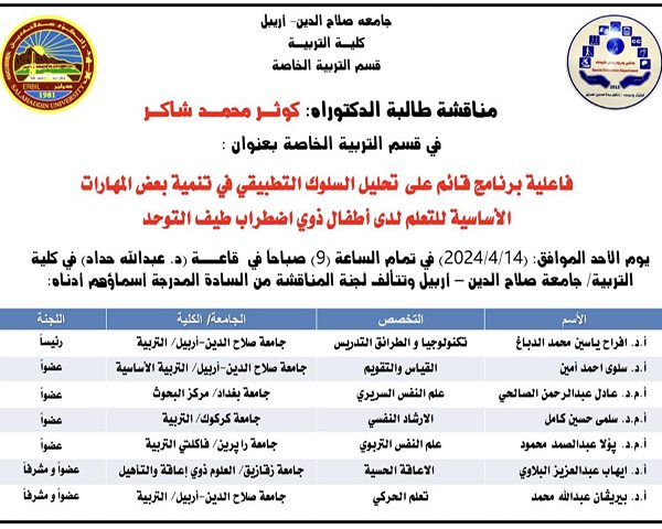 مناقشة طالبتنا في الدكتوراه (كوثر محمد شاكر)Ceo14 أبريل، 2024مناقشة طالبتنا في الدكتوراه: كوثر محمد شاكر جرت المناقشة العلنية لطالبة الدكتوراه : ... اقرأ أكثر